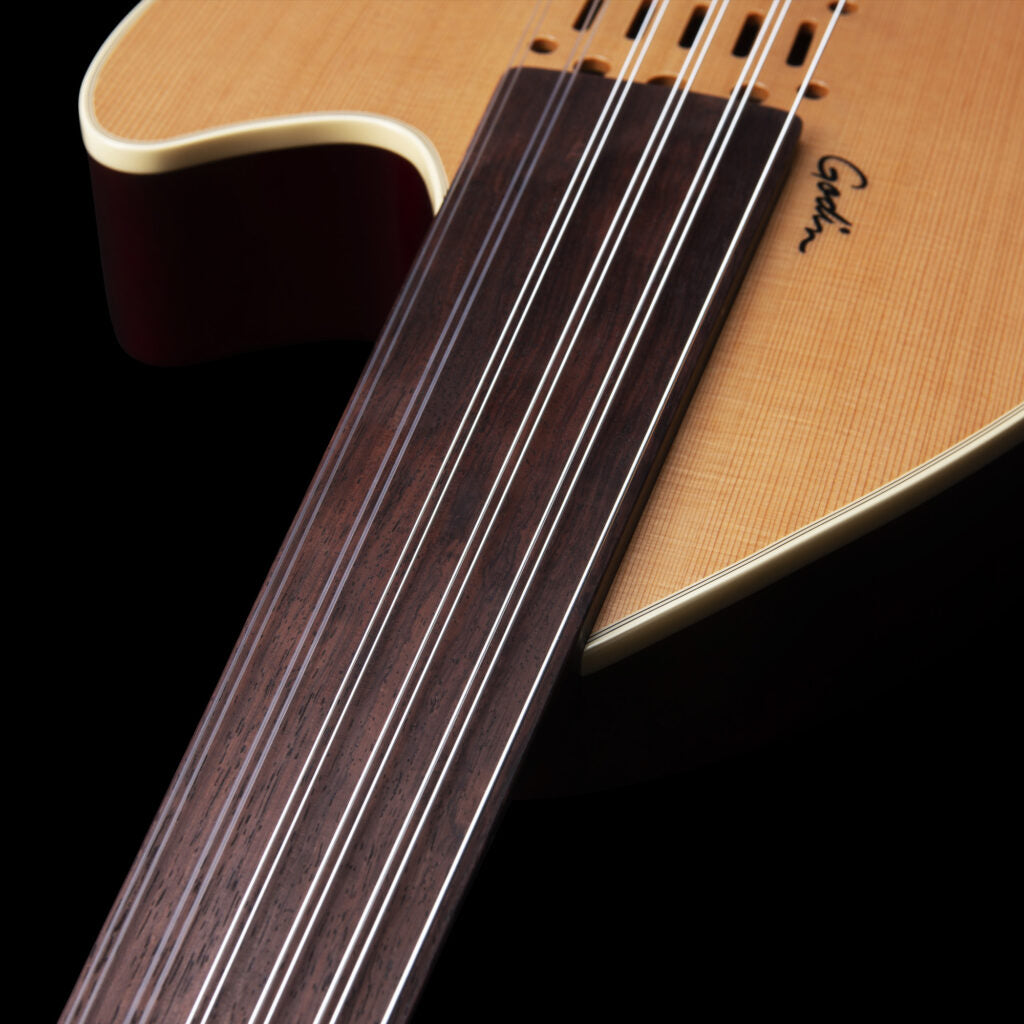 The Godin MultiOud Encore Nylon is an electro-acoustic, fretless instrument featuring 11 nylon strings. Based on the ancient Middle-Eastern Oud, the Godin MultiOud innovates by eliminating tuning and amplification issues that countless musicians face with the more traditional version of the instrument.