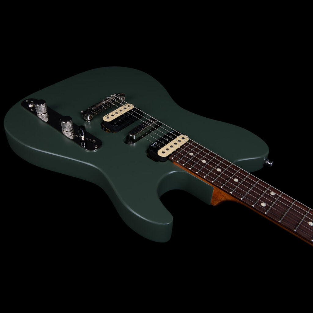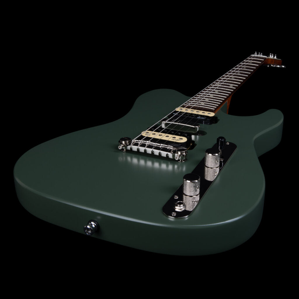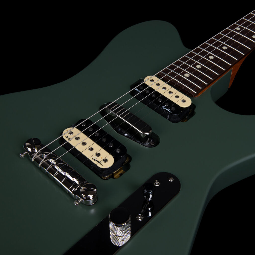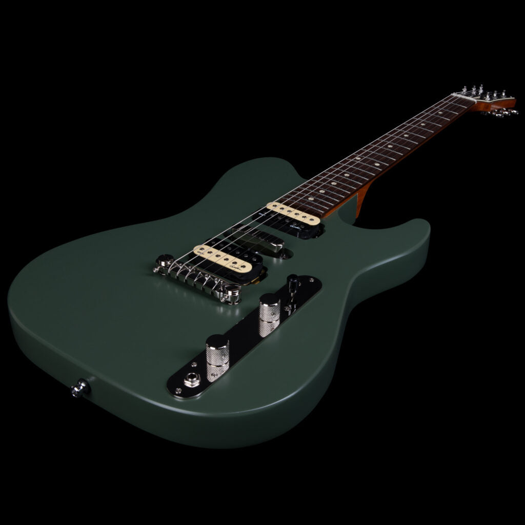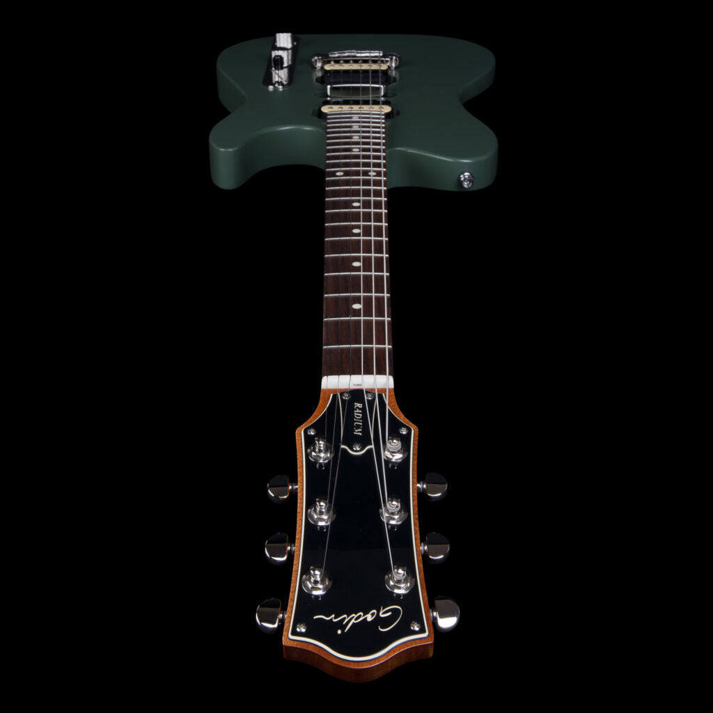 Presenting the Radium Matte Green! It offers an H-S-H pickup configuration for a multitude of tonal possibilities with a pair of hot Custom Godin Zebra Humbuckers and a Godin Custom Cajun Nickel in the middle. It also presents other unique features compared to the more traditional single cutaway solid-bodies, such as a short-scale (24.75”) set-neck and a highly stable 3&3 headstock design for comfortable playing and bending. The guitar also comes equipped with a re-invented vintage-style control plate, which has a volume, push-pull tone, and an angled 5-way switch that follows the natural sweep of your right hand for easy pickup selection. This model has a Canadian Laurentian Basswood body with an eye-catching Matte Green semi-gloss finish and a Mahogany neck, topped by a Rosewood fretboard. The Radium Matte Green…taking it up a notch!